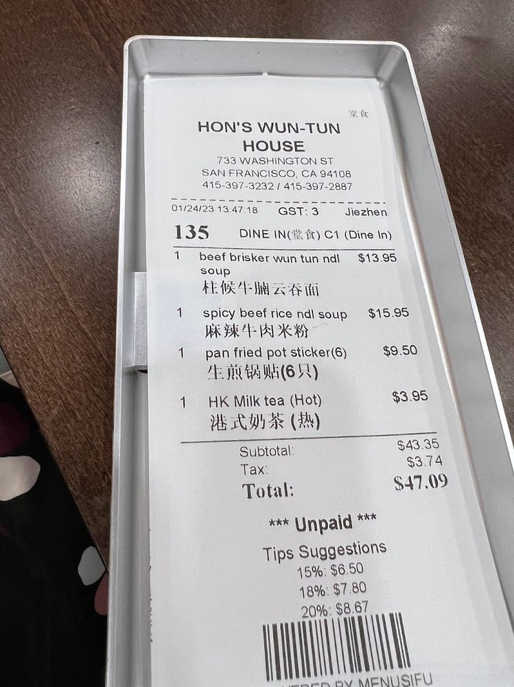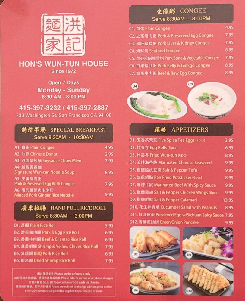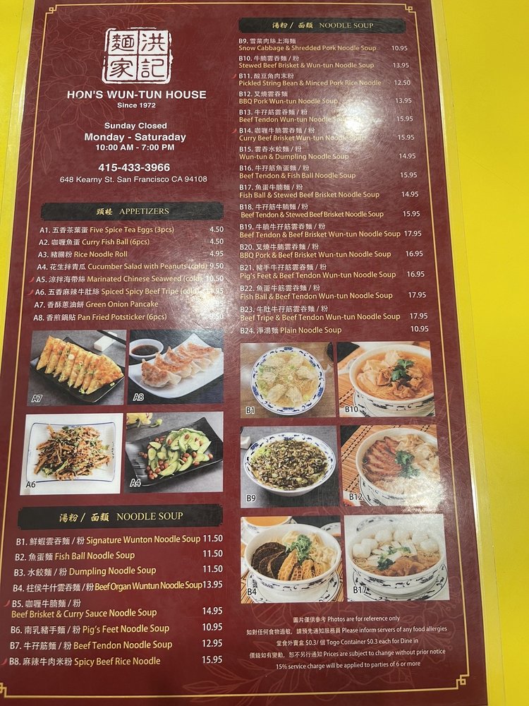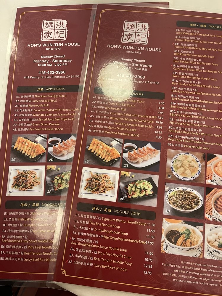 Hon's Wun-Tun House, located in San Francisco's Chinatown, offers authentic Cantonese noodle dishes that have garnered rave reviews from customers. The cozy restaurant serves up delicious and hearty noodle soups like pork wonton and Sichuan dumplings, as well as other favorites like beef brisket wun-tun noodle soup and green chives & pork dumplings. Customers praise the flavorful broth, generous portions, and friendly service at Hon's. The menu also includes traditional dishes like onion pancakes and fish ball soup, all affordably priced. The hand-made noodles and classic recipes have kept patrons coming back for more, making Hon's Wun-Tun House a must-visit for authentic Cantonese cuisine in San Francisco.